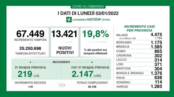 In tutta la Lombardia i nuovi casi sono stati 52.693, con un tasso di positività pari al 22,9 per cento