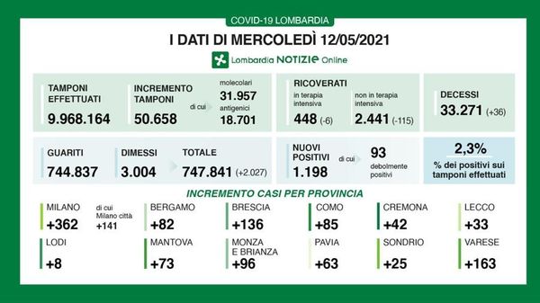 Sono 36 i decessi nelle ultime 24 ore, otto i contagi in provincia di Lodi