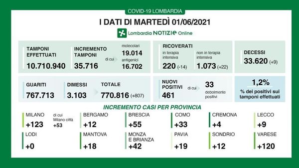In Regione i contagi delle ultime 24 ore sono stati 461, a fronte di 35.716 tamponi e un tasso di positività dell’1,2 per cento