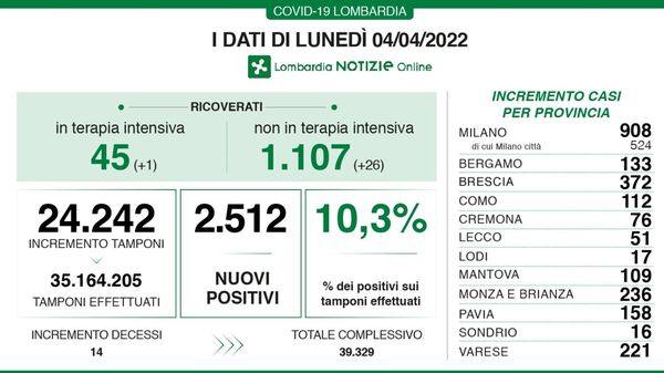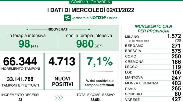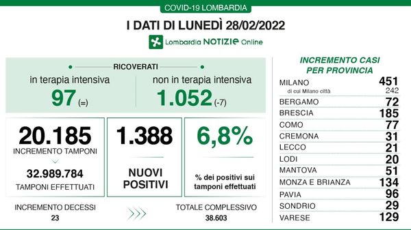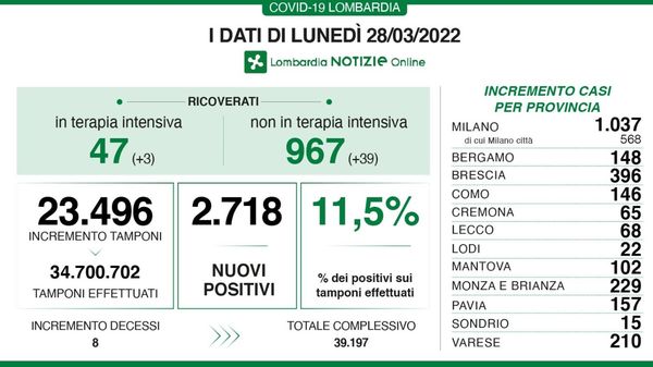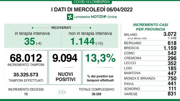 Covid in Lombardia: oggi 9.094 positivi con 12 decessi, in provincia di Lodi 185 nuovi contagi