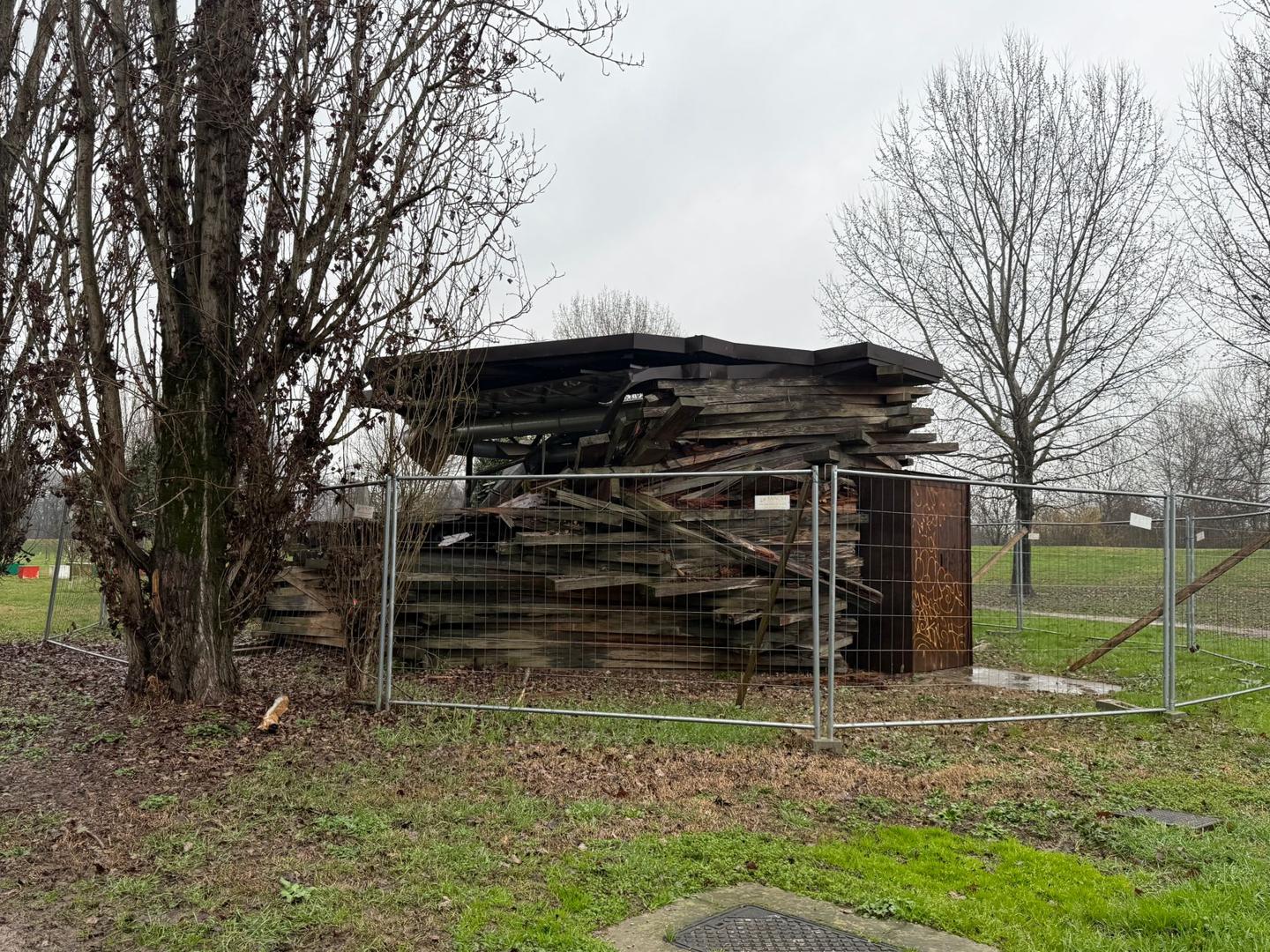 Letteralmente sventrato. Con le piastrelle che penzolano dal soffitto, gli interni esposti, le travi in legno che componevano le pareti cadute rovinosamente nello spazio centrale di quello che doveva essere un luogo di intrattenimento a due passi dal fiume, nel cuore dell’Isolabella. Non c’è più il Bar del Paesaggio: è un ammasso di legno indistinto dalla forma ormai precaria, retta della struttura metallica, quella che si scorge facendo pochi passi una volta imboccata la strada sterrata dal parcheggio di via Massena conduce all’Adda. L’ultimo crollo, fatale, è arrivato nello scorse ore, con la struttura costata ai cittadini di Lodi oltre 300mila euro realizzata e mai aperta al pubblico - diventata oggetto di un contenzioso legale - irrimediabilmente compromessa anche nel suo scheletro originario. Il “nuovo locale alla moda sulle rive dell’Adda”, come scrivevano le cronache dell’epoca, doveva essere pronto per l’autunno del 2012, il gestore fu individuato nell’agosto del 2014, Marco Ballardini di Isolabella Srl, ma subito rinunciò perché trovò il locale allagato. E cominciò lo scaricabarile di responsabilità tra tecnici e imprese che avevano lavorato a una struttura tutta in legno in cui da subito aveva cominciato a entrare la pioggia.